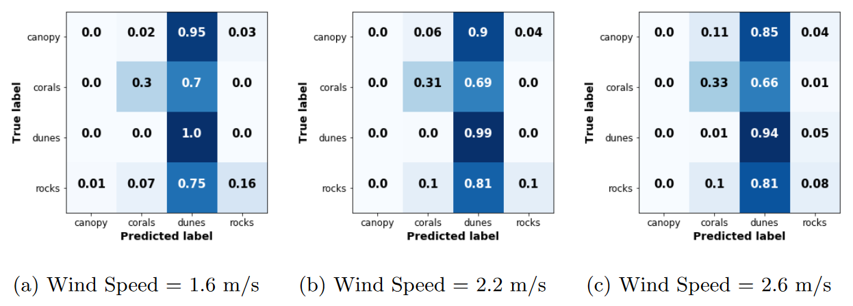 Takeaway Insight: The condusion matrices reveal that the accuracy of the CNN is low because almost all cases are classified as dunes, regardless of the actual bedform. This result is not necessarily surprising. The fan that generated the wind in experiments was oriented along the centerline of the water tunnel; thus, one would expect that the dominant features produced by the wind would be surface waves spanning the width of the tunnel with their crests oriented along the spanwise direction. Of the four model bedforms used, only our model dunes shared this symmetry. Thus, it would appear that the CNN, as trained on images with no wind, learned that the surface signature of dunes involves features with a geometry shared by the features produced by wind—and thus consistently tended to classify windy images as dunes.