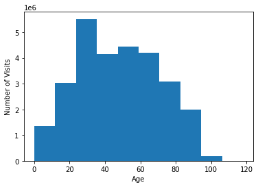 It is valuable to look at the age distribution, and #visits per patient distribution so as to allow for both building reasonable models as well as inferring the results. The below two figures illustrate these statistics for the dataset at hand.