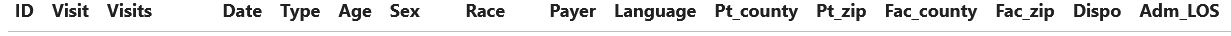 As seen in the figure below for the headers of the demographics information for each patient, there is a unique patient identifier, visit number for that patient in the dataset and the total number of visits, along with the date of visit and age-sex-race-address related demographic data for patients. The snippet below shows the demographic field headers. Note that none of the data is shown to ensure that the data remains private even though the data was already deidentified.