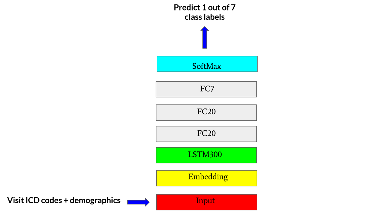 In our model we assign a “ground-truth” label feature by taking the principal ICD code for each visit and matching it to a category from the data dictionary.