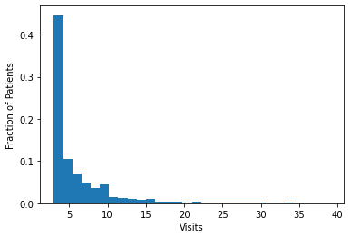 The mean patient age was 48 with a standard deviation of 22. Patients were 56% female with a total of 786 listed as unknown sex. The dataset was restricted to patients with at least 3 visits. The total number of visits per patient had a left skew with the majority of patients having 3 visits during the observation window as can be seen in the figure above.