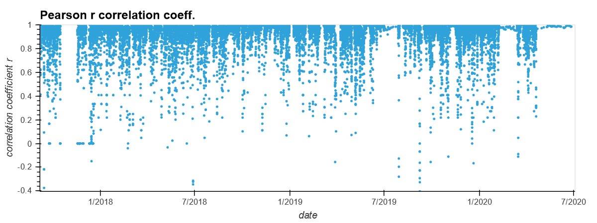 Figure: The Pearson Correlation coefficient between PM10 and PM1 for the device discussed in this post. Notice how the correlation coefficient is almost always ~1