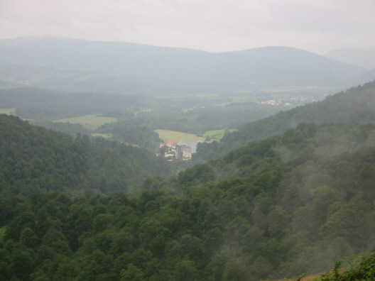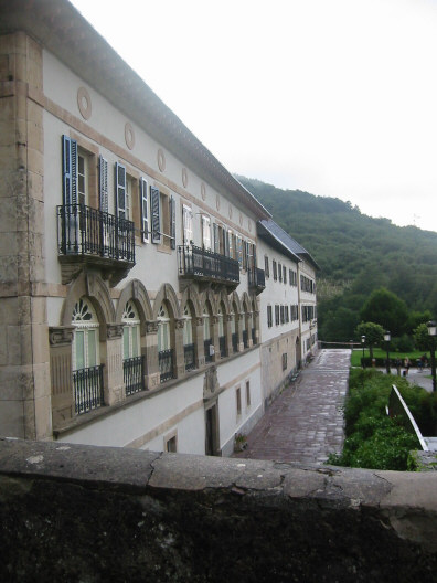 As we crossed the border, the mist came in. And then came the rain. Things looked a bit grim, until through the clouds, far below, we could make out the ancient monastery of Roncesvalles.