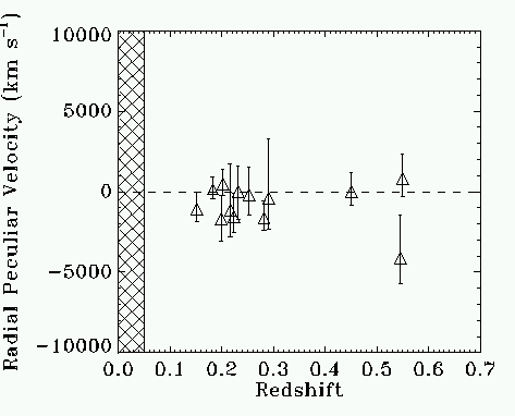 Figure 2: Measurements of each cluster’s peculiar velocity plotted against redshift. The cross-hatched region shows the range that has been probed using optical measurements of peculiar velocities.