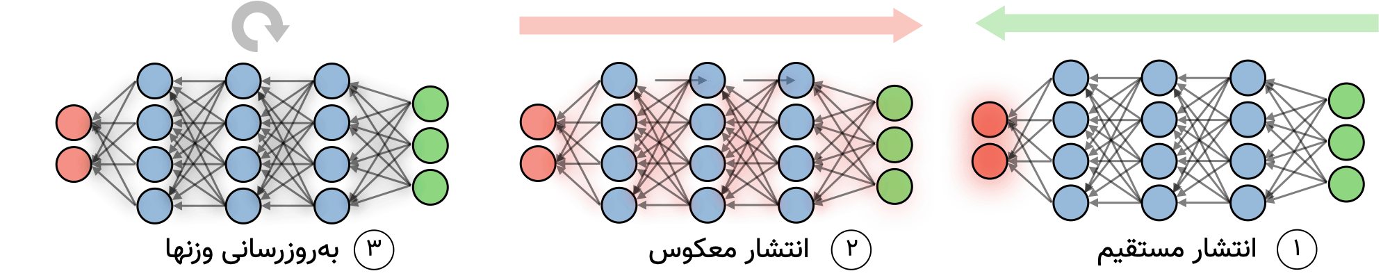 • گام ۳ : با استفاده از مشتقات، وزنهای شبکه بهروزرسانی میشوند