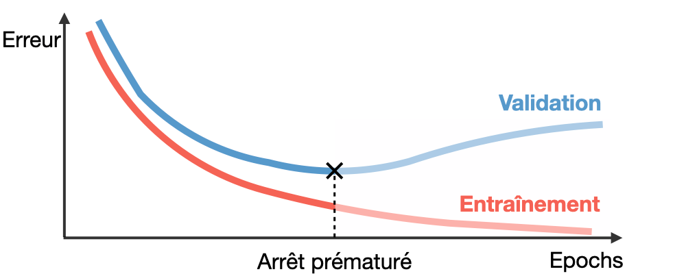 Arrêt prématuré L'arrêt prématuré (en anglais early stopping) is a technique consists in stopping the training phase as soon as the validation loss reaches a plateau or starts to increase.