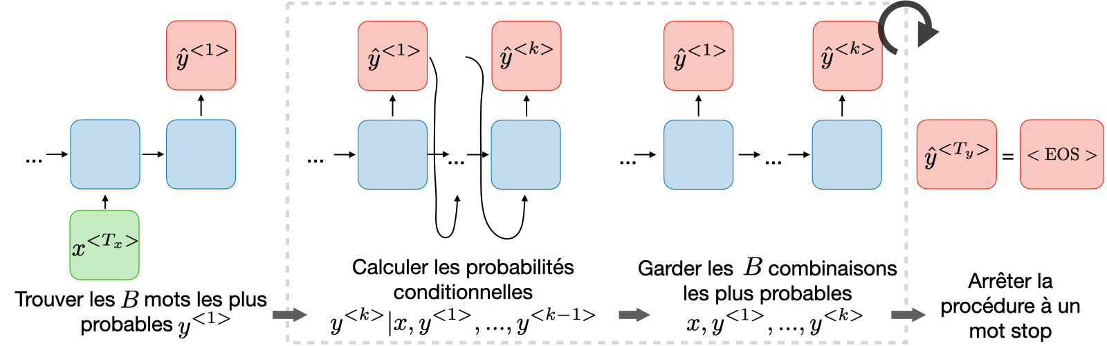 • Étape 3 : Garder les B combinaisons les plus probables $x,y^{< 1>},...,y^{< k >}$