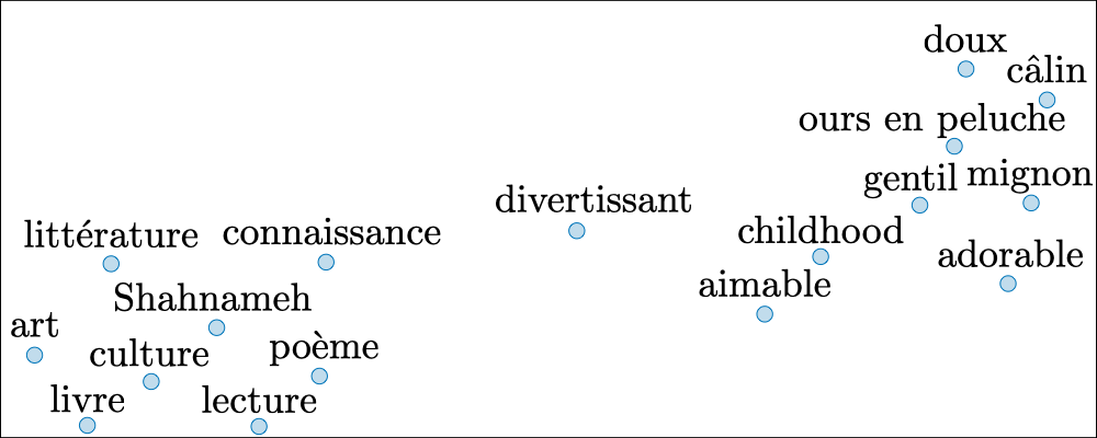 t-SNE La méthode $t$-SNE (en anglais $t$-distributed Stochastic Neighbor Embedding) est une technique visant à réduire une représentation dans un espace de haute dimension en un espace de plus faible dimension. En pratique, on visualise les vecteur-mots dans un espace 2D.
