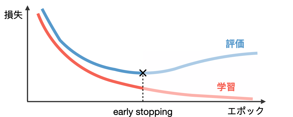 Early stopping バリデーションの損失が変化しなくなるか、あるいは増加し始めたときに学習を早々に止める正則化方法