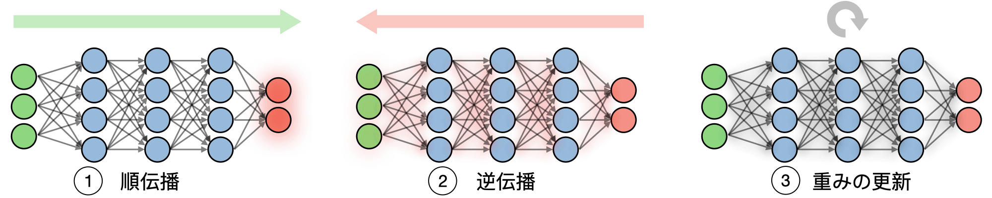 重みの更新 ニューラルネットワークでは、以下の方法にしたがって重みが更新されます。