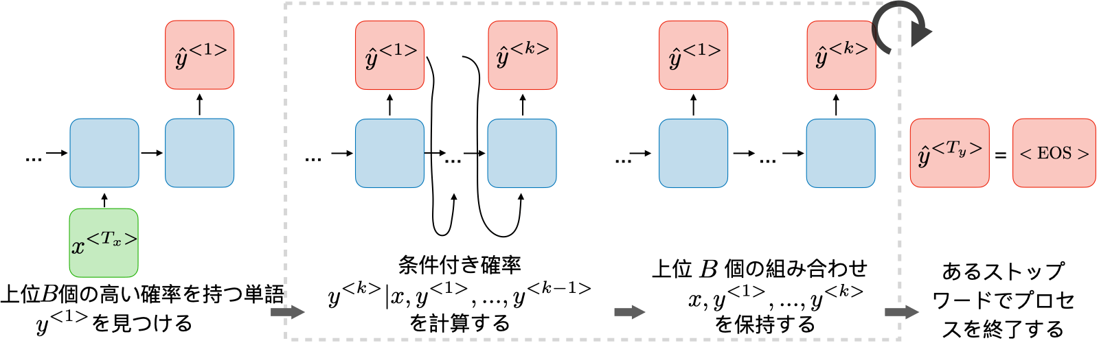 • ステップ1 :上位 $B$ 個の高い確率を持つ単語 $y^{< 1 >}$ を見つける。