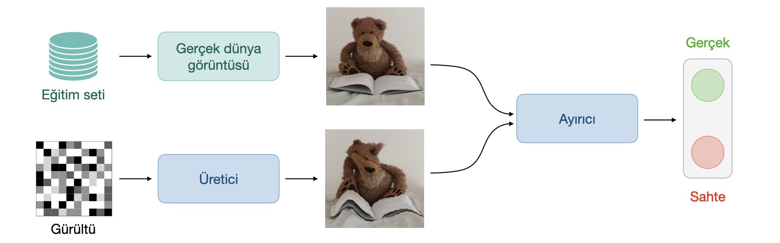 Çekişmeli Üretici Ağlar GAN olarak da bilinen çekişmeli üretici ağlar, modelin üretici denen ve gerçek imajı ayırt etmeyi amaçlayan ayırıcıya beslenecek en doğru çıktının oluşturulmasını amaçladığı üretici ve ayırt edici bir modelden oluşur.