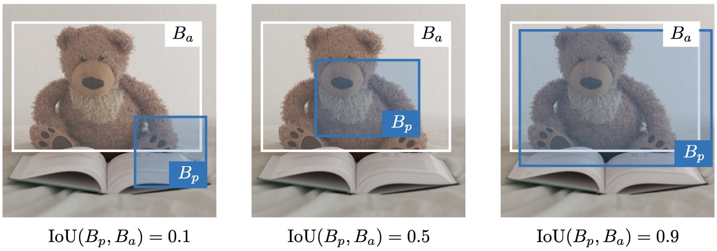 Not: Her zaman $\textrm{IoU}\in[0,1]$ ile başlarız. Kural olarak, Öngörülen bir sınırlama kutusu $B_p$, $\textrm{IoU}(B_p,B_a)\geqslant0.5$ olması durumunda makul derecede iyi olarak kabul edilir.