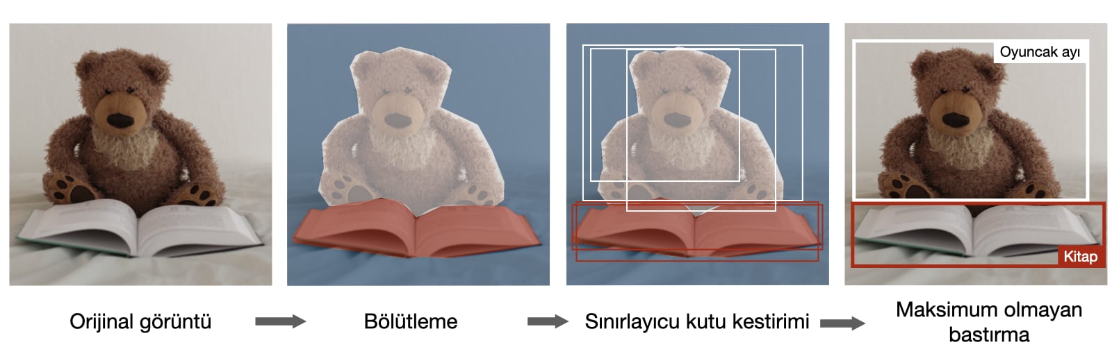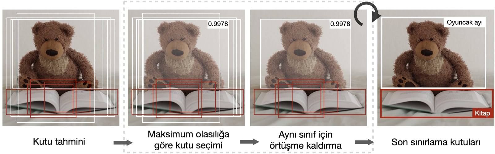 • Adım 3: Potansiyel yineli çakışan sınırlayıcı kutuları kaldırmak için maksimum olmayan bastırma algoritmasını çalıştır.