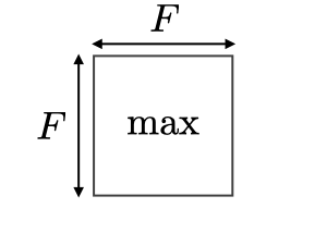 Bir filtrenin boyutları $C$ kanalları içeren bir girişe uygulanan $F\times F$ boyutunda bir filtre, $I \times I \times C$ boyutundaki bir girişte evrişim gerçekleştiren ve aynı zamanda bir çıkış özniteliği haritası üreten $F$ aktivitesi (aktivasyon olarak da adlandırılır $O$) $O \times O \times 1$ boyutunda harita.