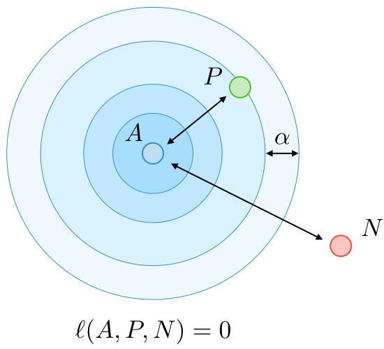 Üçlü kayıp Üçlü kayıp $\ell$, $A$ (öneri), $P$ (pozitif) ve $N$ (negatif) görüntülerinin üçlüsünün gömülü gösterimde hesaplanan bir kayıp fonksiyonudur. Öneri ve pozitif örnek aynı sınıfa aitken, negatif örnek bir diğerine aittir. $\alpha\in\mathbb{R}^+$ marjın parametresini çağırarak, bu kayıp aşağıdaki gibi tanımlanır: