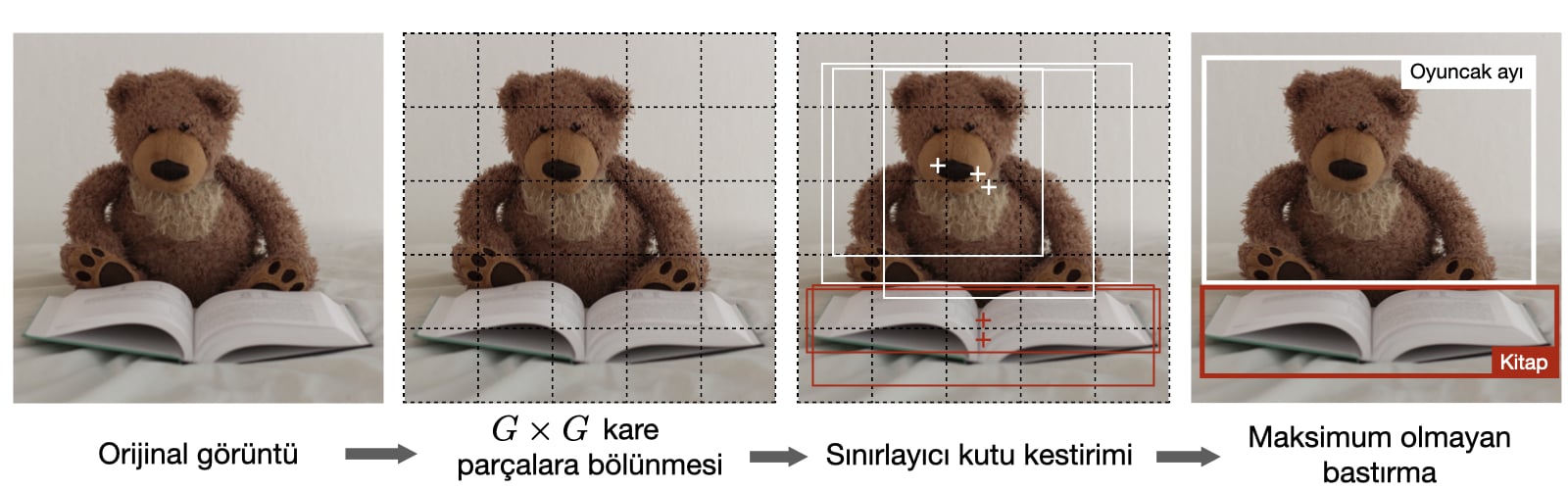 • Adım 1: Giriş görüntüsünü $G\times G$ kare parçalara (hücrelere) bölün.