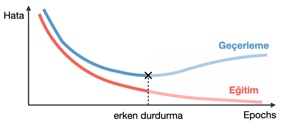 Erken durdurma Bu düzenleme tekniği, onaylama kaybı bir stabilliğe ulaştığında veya artmaya başladığında eğitim sürecini durdurur.