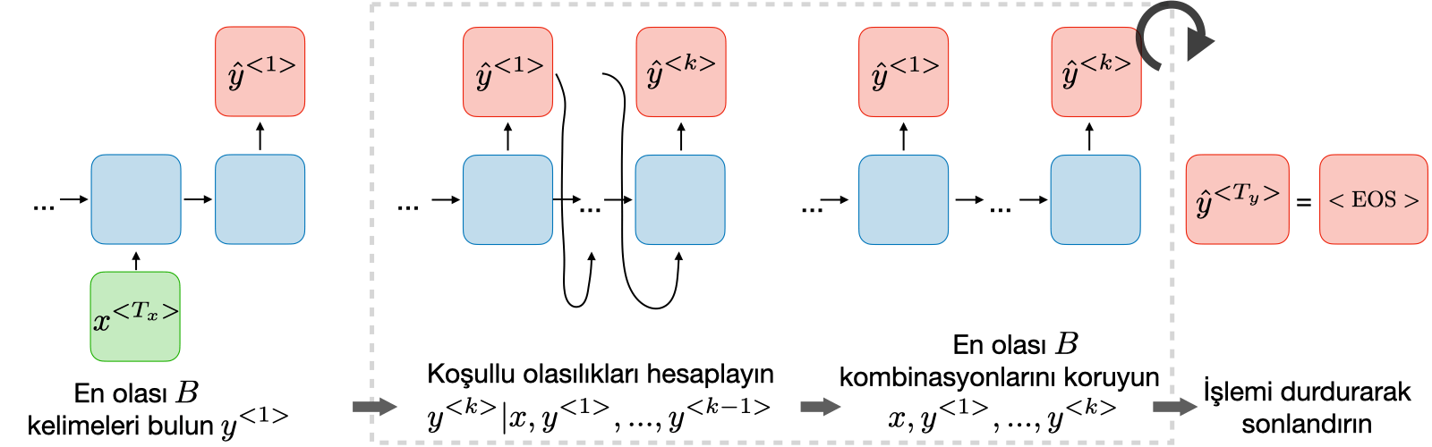 • Adım 2: Koşullu olasılıkları hesaplayın $y^{< k >}|x,y^{< 1 >},...,y^{< k-1 >}$
