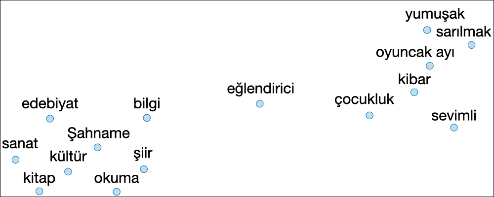 t-SNE $t$-SNE ($t$-dağıtımlı Stokastik Komşu Gömme), yüksek boyutlu gömmeleri daha düşük boyutlu bir alana indirmeyi amaçlayan bir tekniktir. Uygulamada, kelime uzaylarını 2B alanda görselleştirmek için yaygın olarak kullanılır.