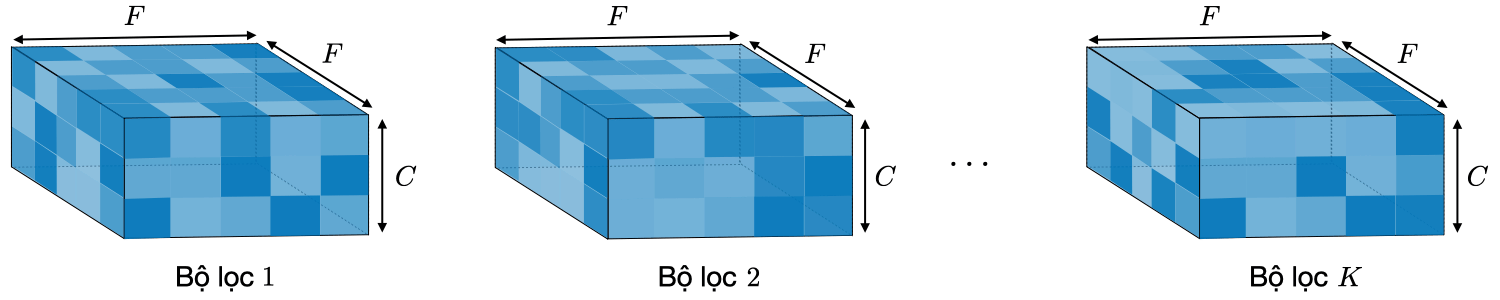 Lưu ý: Việc áp dụng $K$ bộ lọc có kích thước $F\times F$ cho ra một feature map có kích thước $O \times O \times K$.
