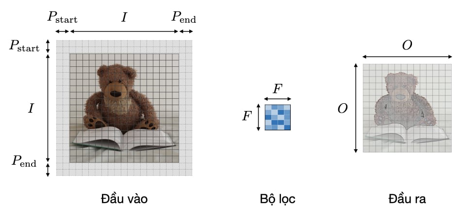 | Kích thước đầu ra | $O \times O \times K$ | $O \times O \times C$ | $N_{\text{out}}$ |