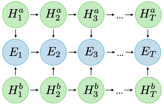 | Factorial HMM | Generate $H_t^o\underset{\small o\in\\{a,b\\}}{\sim} p(H_t^o|H_{t-1}^o)$ Generate $E_t\sim p(E_t|H_t^a,H_t^b)$ | ![]() | Multiple object tracking |