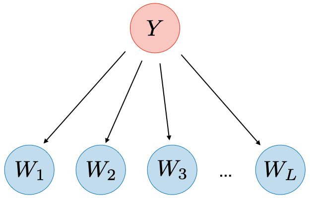 | Naive Bayes | Generate $Y\sim p(Y)$ Generate $W_i\sim p(W_i|Y)$ | ![]() | Document classification |