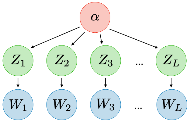 | Latent Dirichlet Allocation (LDA) | Generate $\alpha\in\mathbb{R}^K$ distribution Generate $Z_i\sim p(Z_i|\alpha)$ Generate $W_i\sim p(W_i|Z_i)$ | ![]() | Topic modeling |