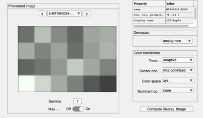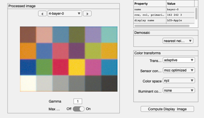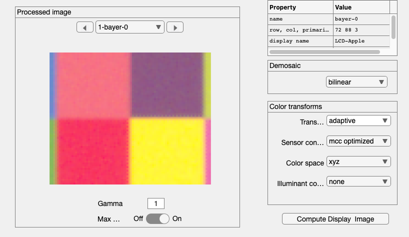 camera = cameraCreate; camera = cameraCompute(camera,scene); camera = cameraSet(camera,'ip demosaic method','adaptive laplacian'); camera = cameraCompute(camera,scene); cameraWindow(camera,'ip');