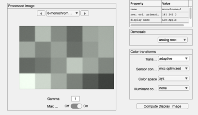 scene = sceneCreate; oi = oiCreate; sensor = sensorCreate; ip = ipCreate; oi = oiCompute(oi,scene); sensor = sensorCompute(sensor,oi); ip = ipSet(ip,'demosaic method','bilinear'); ip = ipCompute(ip,sensor); ipWindow(ip);