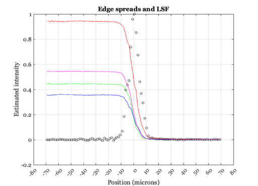 % From the 2001 functions mtfData = ieISO12233(ip,sensor); ieNewGraphWin; plot(mtfData.lsfx*1e3,mtfData.esf); grid on; xlabel('Position (microns)'); ylabel('Estimated intensity') title('Edge spreads and LSF'); set(gca,'xtick',-80:10:80) hold on; plot(mtfData.lsfx*1e3,mtfData.lsf,'ko');