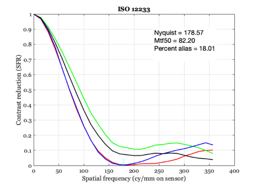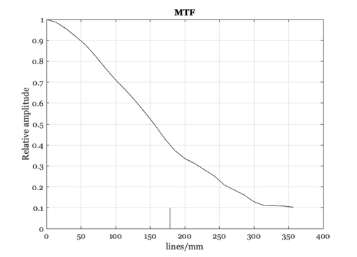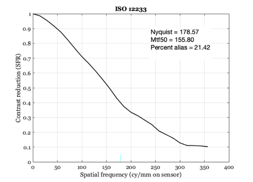 We measure the system MTF properties using a simple slanted bar target along with the ISO 12233 standard methods.