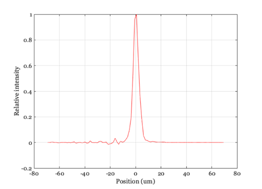 ieNewGraphWin; plot(mtfData.lsfx*1000, mtfData.lsf); xlabel('Position (um)'); ylabel('Relative intensity'); grid on
