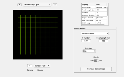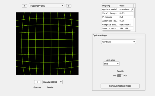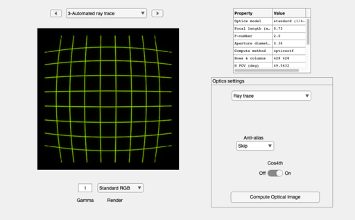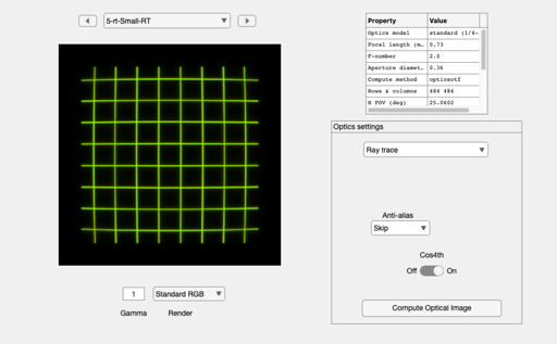 % The first calculation was spatially coarse, and inappropriate % for a geometric calculation such as barrel distortion. % % Here, we make the scene smaller and recalculate. With this % field of view there is no noticeable distortion, but the sample % spacing is much finer so we can see the various point spread % functions % % At this resolution, the calculation takes a little while. sceneSmall = sceneSet(scene,'name','rt-Small-Grid'); sceneSmall = sceneSet(sceneSmall,'fov',20); % Ray trace calculation with distortion and shift-variant blurring oi = oiCompute(oi,sceneSmall); oi = oiSet(oi,'name','rt-Small-RT'); oiWindow(oi);