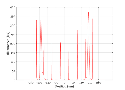 oiDL = oiSet(oi,'optics model','diffraction limited'); optics = oiGet(oiDL,'optics'); % Set the diffraction limited f# from the ray trace values fNumber = opticsGet(optics,'rt fnumber'); optics = opticsSet(optics,'fnumber',fNumber); oiDL = oiSet(oiDL,'optics',optics); % Now set the method to diffraction limited and compute oiDL = oiSet(oiDL,'name','DL method'); oiDL = oiCompute(oiDL,scene); % No barrel distortion, less blurring oiWindow(oiDL); % Here is a horizontal line of illuminance dlData = oiPlot(oiDL,'illuminance hline',[1,64]);