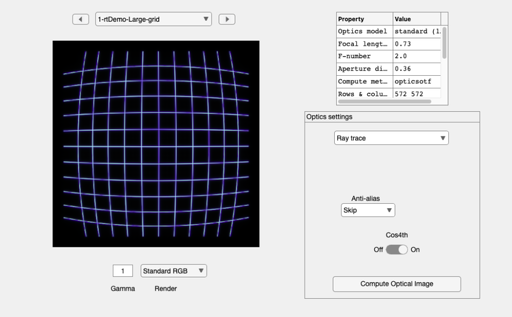 scene = sceneCreate('gridlines',[512 512], 48); scene = sceneInterpolateW(scene,(450:100:650)); % Small wavelength sample scene = sceneSet(scene,'hfov',45); scene = sceneSet(scene,'name','rtDemo-Large-grid'); % Show the grid line scene ieAddObject(scene); sceneWindow;