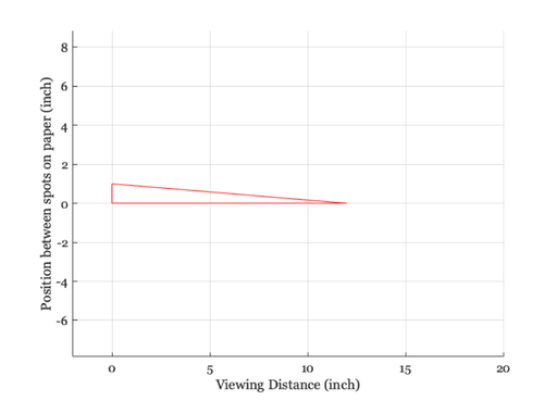 ieNewGraphWin; line([0 viewingDistance 0 0],[0 0 1 0]); axis equal set(gca,'xlim',[-2 20]), grid on xlabel('Viewing Distance (inch)') ylabel('Position between spots on paper (inch)')
