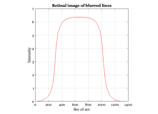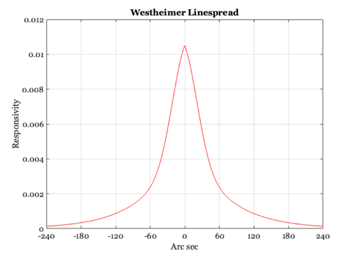 % Westheimer calculated that the linespread function of the human % eye, specified in terms of minutes of arc and using a 3mm % pupil, should be approximated using the following formula % % LineSpread = 0.47*exp(-3.3 *(x.^2)) + 0.53*exp(-0.93*abs(x)); % % Suppose we wish to plot the function by defining the spatial % variable, x, in terms of seconds of arc, xSec = -300:1:300; xMin = xSec/60; ls = 0.47*exp(-3.3 *(xMin.^2)) + 0.53*exp(-0.93*abs(xMin)); ls = ls / sum(ls); ieNewGraphWin; plot(xSec,ls) set(gca,'xlim',[-240 240],'xtick',(-240:60:240)), grid on xlabel('Arc sec'), ylabel('Responsivity'), title('Westheimer Linespread') % From our previous calculation, we observed that the dots in a 600 dpi % printer, viewed at 12 inches, are spaced 28.5819 sec of visual angle % apart. At this distance, the linespread has fallen to about one-half of % its peak value. % Hence, if we could control the intensity and color of the printed dots -- % which we cannot do on conventional laser printers -- then at this viewing % distance we would be able to produce images that were very realistic in % their appearance.