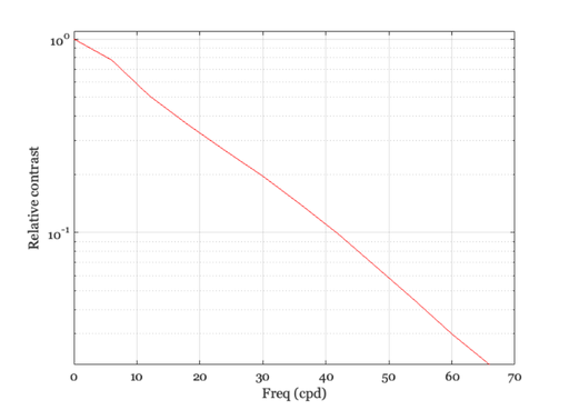 xSec = -300:300; % 600 sec, total = 10 min westheimerOTF = abs(fft(westheimerLSF(xSec))); % One cycle spans 10 min of arc, so freq=1 is 6 c/deg freq = [0:11]*6; ieNewGraphWin; semilogy(freq,westheimerOTF([1:12])); grid on; xlabel('Freq (cpd)'); ylabel('Relative contrast'); set(gca,'ylim',[0 1.1])