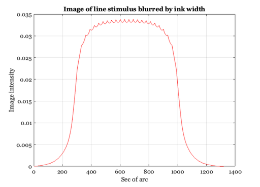 % We can estimate the visual image created by an image printed at 600 dpi % using the following simple convolution calculation. Let's create an image % that spans 0.2 deg and has a dot every 30 sec. (i.e., roughly 28.58) dotSpacing = 30; secPerDeg = 60*60; x = 1:0.2*secPerDeg; im = zeros(1,length(x)); im(1:dotSpacing:length(im)) = ones(size(im(1:dotSpacing:length(im)))); % Here is an image showing the sampled line positions % (The lines represent a printer dot) ieNewGraphWin; imshow(im(ones(1,128),1:512)) title('Image of line stimulus'); % Each line in the physical image adds a unit linespread to the retinal % image. We can compute the retinal image by forming the convolution of % the image with the Westheimer linespread function. Remember: we sampled % the linespread once every sec of arc. So, we can simply convolve the % image and the linespread function now as: retIm = conv2(ls,im,'full'); ieNewGraphWin; plot(retIm),grid on title('The one-dimensional retinal image') xlabel('Sec of arc'), ylabel('Image intensity') % (If the colors in the image look funny, make sure to place your % cursor inside the window. This may change the local color % map). % While the original image varies from black to white, after blurring by % the eye's optics, there is only a small amount of residual variation in % the retinal image. Because of the blurring, the retinal image is much % more likely the image of a bar than it is the image of a set of % individual lines. % In fact, the dots placed on the page are not perfect line samples. Each % ink line has some width. So, a more realistic input image might be % created by blurring the stimulus and then convolving with the linespread. gKernel = fspecial('gaussian',[1,30],2); % This produces a little Gaussian window for filtering blurIm = conv2(im,gKernel,'full'); blurIm = ieScale(blurIm,1,32); retIm = conv2(blurIm,ls,'full'); ieNewGraphWin; imshow(blurIm(ones(1,128),1:512),[]); title('Image of line stimulus blurred by ink width'); % Notice the very small ripples left in the curve after taking % into account the blurring by the physical display and by the % eye. ieNewGraphWin; plot(retIm), axis square, grid on title('Retinal image of blurred lines') xlabel('Sec of arc'), ylabel('Intensity') % The question you might ask yourself now is this: will those % small ripples be detectable by the observers? How can we tell? % You might also ask what will happen when we view the page at 6 % inches, or at 24 inches. What if we increase the printer % resolution to 1200 dpi? What if we introduce some ability to % modulate the density of the ink and hence the light scattered % back to the eye?