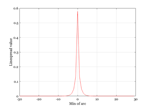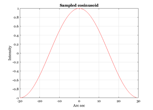 % First, make a new linespread function that is smaller and % easier to compute with. Have it extend over 1 deg (60 min) so % the Fourier Transform is easier to interpret xMin = -30:1:29; ls = 0.47*exp(-3.3 *(xMin.^2)) + 0.53*exp(-0.93*abs(xMin)); ls = ls / sum(ls); ieNewGraphWin; plot(xMin,ls), grid on xlabel('Min of arc'),ylabel('Linespread value') % Now, consider the retinal image that is formed by some simple % harmonic functions. Here is a sinusoid that varies at 1 cycle % per degree of visual angle. nSamples = length(xMin); f = 1; harmonic = cos(2*pi*f*xMin/nSamples); ieNewGraphWin; plot(xMin,harmonic), grid on title('Sampled cosinusoid') xlabel('Arc sec'), ylabel('Intensity')
