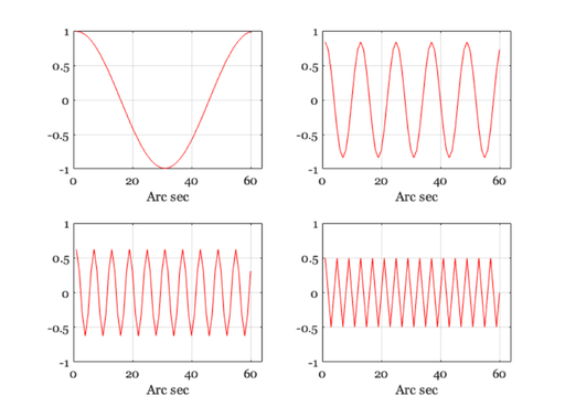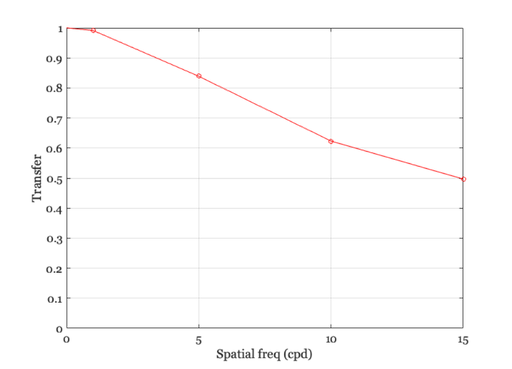 % Notice that the amplitude of the cosinusoid falls off as the spatial % frequency increases. We will store the amplitude of the cosinusoid in % the variable "peak". ieNewGraphWin; freq =[1 5 10 15]; peak = zeros(1,length(freq)); for i = 1:length(freq) harmonic = cos(2*pi*freq(i)*xMin/nSamples); retIm = convolvecirc(harmonic,ls); subplot(2,2,i) plot(retIm), grid on, set(gca,'ylim',[-1 1],'xlim',[0 64]); xlabel('Arc sec') peak(i) = max(retIm(:)) end % We can plot the amplitude of the retinal cosinusoid, and its % amplitude decreases with the input frequency. I also use the % fact that at f = 0 the amplitude = 1 (because the area under % the linespread is 1). ieNewGraphWin; plot([0 freq],[1 peak],'-') set(gca,'ylim',[0 1]) xlabel('Spatial freq (cpd)'), ylabel('Transfer') grid on