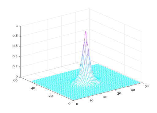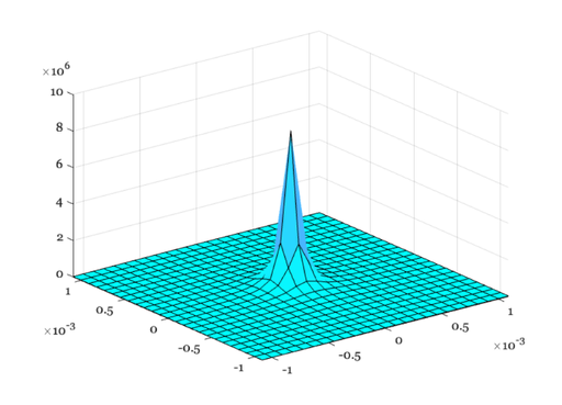 % The PSF is circularly symmetric. So, we can accumulate % the 1D values into a 2D surface. % angleInRad2D = linspace(min(angleInRad)/4,max(angleInRad)/4,length(angleInRad)/4); nSamples = length(angleInRad2D); [X,Y] = meshgrid(angleInRad2D,angleInRad2D); % Because the pointspread function is symmetric, we can calculate the value by % building a matrix D that measures only the distance from the center of matrix. % Try plotting this distance matrix using the command: % % imagesc(D); colorbar; axis image % D = sqrt(X.^2 + Y.^2); % Now, loop through the rows of D to calculate the pointspread values % as a function of angle. % iPSF2D = zeros(size(D)); for ii=1:nSamples a = D(ii,:); [iMTF, iPSF2D(ii,:)] = ijspeert(age, pupil, pigmentation, ... freqIndexRange, a); end ieNewGraphWin; colormap(cool(64)); surf(angleInRad2D,angleInRad2D,iPSF2D);