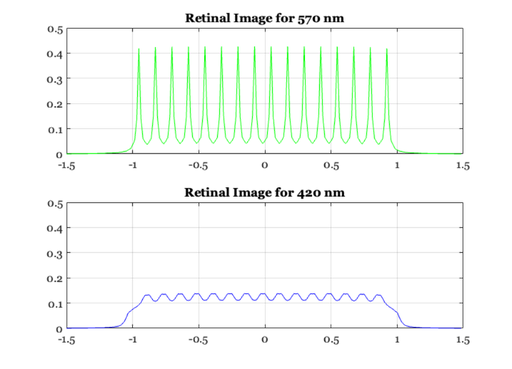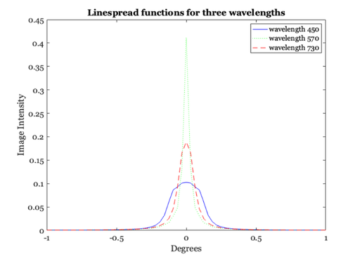 % The linespread varies quite strongly with wavelength. When the % eye is in good focus at 580 nm (yellow-part of the spectrum) % the light in the short-wavelength (400-450nm) is blurred quite % strongly and light in the long-wavelength part of the spectrum % is blurred, too, though somewhat less. We can calculate the % linespread as a function of wavelength (Marimont and Wandell, % 1993) from basic principles. The linespreads a various % wavelengths are contained in the data file: load lineSpread; % linespread 370-730nm, in 1nm steps. % This was generated by the script ChromAb.m by Wandell and % Marimont. xDim is in degrees of visual angle. % We select three wavelengths and plot their linespread functions % together. Notice that for the shorter wavelength, the % linespread function is much more spread-out than for the middle % and long wavelengths. ieNewGraphWin; plot(xDim, lineSpread(80, :), 'b-', xDim, lineSpread(200,:), ... 'g:', xDim, lineSpread(361, :), 'r--' ); legend('wavelength 450', 'wavelength 570','wavelength 730'); xlabel('Degrees'); ylabel('Image Intensity'); title('Linespread functions for three wavelengths'); % Look at the line spread functions for all wavelengths lw = 1:10:length(wave); ieNewGraphWin; colormap(hot(32)); mesh(xDim, wave(lw), lineSpread(lw,:)); set(gca,'xlim',[-1 1],'ylim',[350 730]) ylabel('wavelength (nm)'); xlabel('degrees'); zlabel('intensity'); % Different wavelength components of an image are blurred to % different extents by the eye. We use a set of lines again as % an example. For this computation, we will assume that the % input begins with equal energy at all wavelengths from 370 to % 730 nm. % Here, we create and display the image of sample lines. im = reshape([0 0 0 1 0 0 0 0]' * ones(1, 16), 1, 128); imshow(im(ones(100,1), 1:128)); % To calculate the retinal image for this pattern, we % convolve each wavelength component of the image with the % appropriate linespread function. The routine conv2 takes the % input image (im, size(im) = 1 128) and convolves it with each % of the linespread functions in lineSpread size(lineSpread = % 361,65). This results in 361 images (one for each % wavelength). retIm = conv2(im, lineSpread, 'full'); % We must remember the size (in deg) of each sample point this way. % X = (-size(retIm,2)/2 : ((size(retIm, 2)/2) - 1)) / 64; % We can plot the retinal image corresponding to two wavelengths % this way. ieNewGraphWin; subplot(2,1,1) plot(X,retIm(201,:),'g-') set(gca,'ylim',[0 0.5]) title(sprintf('Retinal Image for %d nm', wave(201))); grid on subplot(2,1,2) plot(X,retIm(51,:),'b-') set(gca,'ylim',[0 0.5]) title(sprintf('Retinal Image for %d nm', wave(51))); grid on % Notice that the two images have the same mean, they only differ % in terms of the contrast: the green image has a lot more % contrast, but the same mean. mean(retIm(50,:),2) mean(retIm(200,:),2) % The short wavelength (420 nm) component is blurred much more than the % longer wavelength component of the image. Hence, the image has very low % amplitude ripples, and appears almost like a single, uniform bar. The % 570nm component, however, has high amplitude ripples that are quite % distinct. Hence, the short-wavelength variation would be very hard to % detect in the retinal image, while the 570 nm component would be quite % easy to detect.