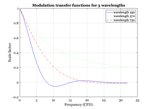 % Finally, let's make a few graphs of the modulation transfer function of % the eye's optical system for individual wavelengths. For short % wavelength lights, high spatial frequency contrast is attenuated a lot by % the optical path of the eye. % Load the MTFs for wavelengths from 370-730nm. These were calculated % using the methods in Marimont and Wandell that are in a script in the % /local/class/psych221/tutorials/chromAb sub-directory. load combinedOtf; % Here is a graph of a few of the MTFs % ieNewGraphWin; plot(sampleSf, combinedOtf(81, :), 'b-', ... sampleSf, combinedOtf(201,:), ... 'g:', sampleSf, combinedOtf(361, :), 'r--' ); legend('wavelength 450', 'wavelength 570','wavelength 730'); xlabel('Frequency (CPD)'); ylabel('Scale factor'); grid on title('Modulation transfer functions for 3 wavelengths'); % Notice that the amplitude of the short-wavelength becomes negative. This % occurs because the blurring is so severe that the harmonic function is % reproduced in the opposite phase compared to the input harmonic. Hence, % the amplitude is represented by a negative number. This was illustrated % in class using the slide projector, and the phenomenon is called % "spurious resolution."