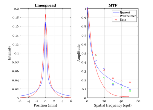 % In recent years, Ijspeert and others in the Netherlands developed a more % extensive set of functions to predict the basic image formation variables % in the average human eye. The curves they derived were based on % empirical inspection of data sets, and do not have any strong theoretical % foundation. Still, they are probably more accurate than the Westheimer % function and they are parameterized for the subject's age, pigmentation % and pupil diameter. Hence, for practical computation, these are probably % more useful. % A student in Psych 221 developed the code to compute these % values in the function "ijspeert." Here is an example % age = 20; % Subject's age pupil = 4; % diameter in mm pigmentation = 0.142; % Caucasian freqIndexRange = 1:50; % The spatial frequency range % Set the span to be 1 deg, so we know that 1 cycle in the MTF % corresponds to 1 cycle per deg % angleInDeg = (-.25:.005:.25); angleInSec = angleInDeg*3600; angleInRad = angleInDeg*deg2rad; [iMTF, iPSF, iLSF] = ijspeert(age, pupil, pigmentation, ... freqIndexRange, angleInRad); % The functions should be normalized so that the area under the % linespread and the first value of the MTF are one. % iMTF = iMTF/iMTF(1); iLSF = iLSF/sum(iLSF); % These are the modulation transfer function and linespread % for the ijspeert data ieNewGraphWin; %clf subplot(1,2,1), plot(iMTF); grid on set(gca,'xtick',(0:10:80),'xlim',[0 80]); xlabel('Spatial frequency (cpd)'); ylabel('Amplitude'); title('MTF') % Here is the linespread function subplot(1,2,2), plot(angleInSec,iLSF); grid on xlabel('Position (sec)'); ylabel('Intensity'); set(gca,'xtick',(-500:250:500),'xlim',[-500 500]); title('Line spread') % We can compare the ijspeert and westheimer linespread functions xMin = angleInSec/60; ls = 0.47*exp(-3.3 *(xMin.^2)) + 0.53*exp(-0.93*abs(xMin)); ls = ls / sum(ls); westMTF = abs(fft(ls)); clf subplot(1,2,1) plot(angleInSec/60,iLSF,'b-',angleInSec/60,ls,'r-') set(gca,'xtick',(-8:2:8),'xlim',[-6 6]); xlabel('Position (min)'), ylabel('Intensity'), title('Linespread') grid on % Comparison of the MTFs with the Williams data load williams subplot(1,2,2) n = length(iMTF); freq = 0:(n-1); plot(freq,iMTF(1:n),'b-',freq,westMTF(1:n),'r-') hold on plot(dataF,dhb,'ro',dataF,drw,'go',dataF,rnb,'bo') xlabel('Spatial frequency (cpd)'), ylabel('Amplitude'), title('MTF') set(gca,'ylim',[0 1]) grid on hold off legend('Ijspeert','Westheimer','Data')