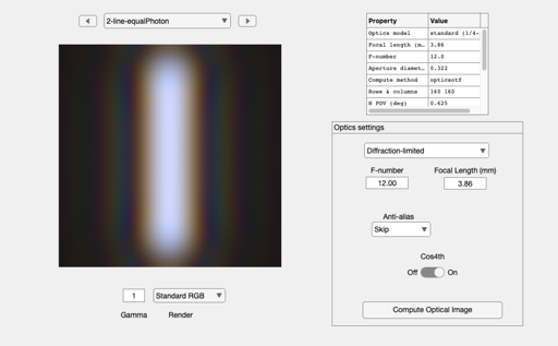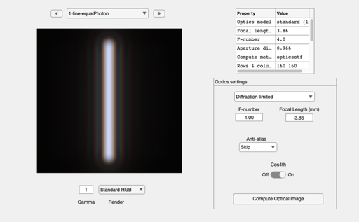 3. In ISET, you can adjust the fnumber and focal length directly. But you cannot adjust the aperture directly. Two out of three ain't bad. Suppose you want to configure diffraction-limited optics with an aperture of 0.1mm and a focal length of 0.4mm. How would you set the parameters? Help: The f-number is focal length divided by aperture diameter