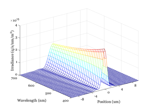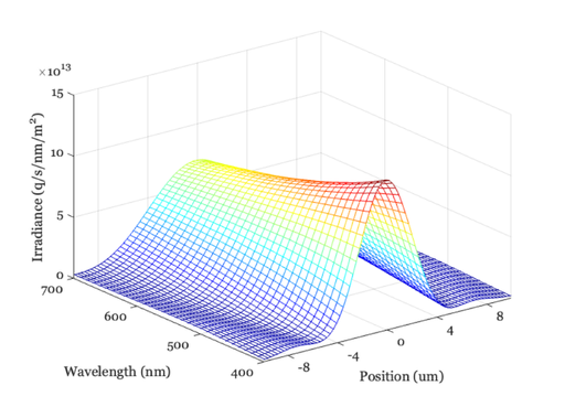 oi = oiCreate; % Default optics is defraction limited oi = oiCompute(oi,scene); ieAddObject(oi); oiWindow; % Plot the line spread as a function of wavelength oiPlot(oi,'irradiance hline',[80 80]); set(gca,'xlim',[-10 10]); % Plot radiance at central 10 um