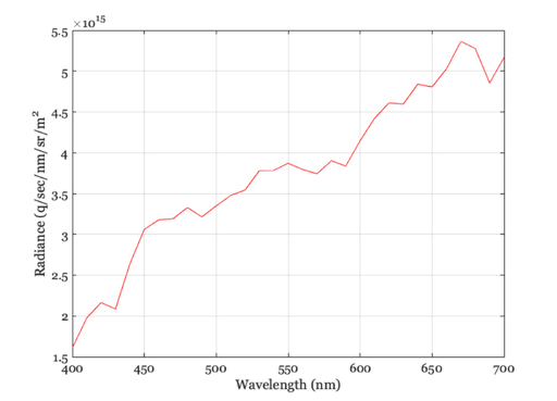 ieNewGraphWin; plot(wave,meanPhotons); xlabel('Wavelength (nm)'); ylabel('Radiance (q/sec/nm/sr/m^2'); grid on